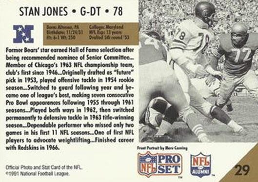 Stan Jones reminds us that an athlete can attain the highest awards in his or her chosen sport yet remain relatively underappreciated or noted by all but his teammates and peers. How one understates the accomplishments of a football player who is in the Pro Football Hall Of Fame, College Football Hall Of Fame, and the Halls Of Fame of his college, the University of Maryland, and state as a member of the Pennsylvania Sports Hall Of Fame is astounding. Known as unfailingly tough, durable, quick, and having earned the moniker as “the strongest man in football” during his playing days certainly should have kept Jones in the memories of all who are fans of the sport.