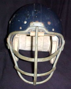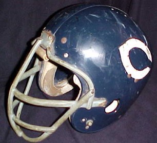 This classic "Wilson" helmet proudly reflects those infamous "monsters of the midway" during their 1963 championship season. The dark navy or midnight blue shell, which matched their jerseys, was often incorrectly confused as black in color. Please notice the correct period "Schutt" face mask bolted directly to the shell. The direct bolt-on style was later replaced by flexible mounting clips that absorbed force better which reduced neck injuries and allowed the mask to be removed quicker if necessary. The Bears, unlike the rest of the league, used "Wilson" rather "Riddell" helmets as their founder and long time owner / coach George "Papa Bear" Halas had personal business ties with the Wilson Sporting Goods Co. which was headquartered in Chicago.