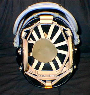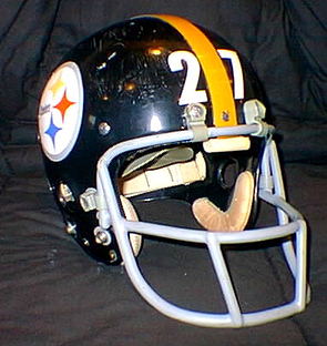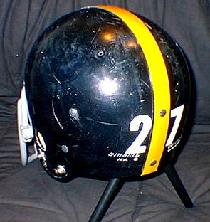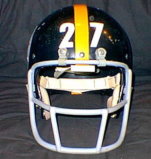 It is easy to picture former Steeler "db" Glen Edwards wearing this helmet during his early years with the team that was soon to become a dynasty. This rugged beauty is a very rare Riddell "Kralite - 8" model with a 1971 time clock stamped into its black impregnated (not painted) shell. It is complete with leather jaw pads, rubber crown piece, correct period white nose snubber and Schutt facemask with gray clips. This helmet has been carefully restored to reflect actual "midseason" condition. The "dark mustard" colored center stripe and slightly wider font (compared to later years) numerals have been correctly replicated. Close examination of the helmet's Steeler logo reveals the same familiar thin creases that were evident on actual Steeler helmets from that era -- this is the result of using the exact same "destructible" vinyl decals that were used by the team during that period (the team also slit some of the decals prior to application attempting to reduce this creasing effect). This is the same vintage helmet that was used by many great Steeler players when they started their championship climb in the early 1970s. A great period and a great helmet for Steeler fans. Thanks Marc!